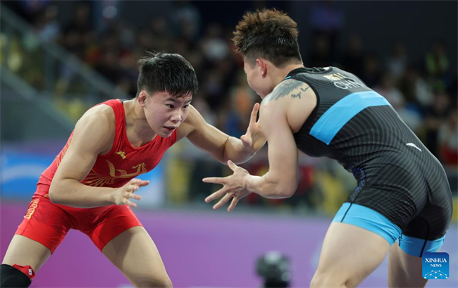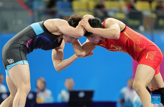 Zhang Jin (R) of Jiangsu competes against Pang Qianyu of Hunan during the women's freestyle 53kg final match of wrestling at China's 15th National Games in Qingyuan, south China's Guangdong Province, Nov. 10, 2025. (Xinhua/Li Ran)