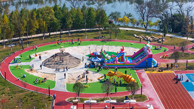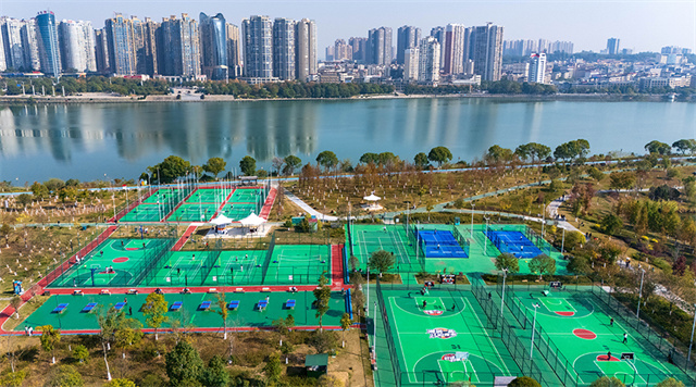 The photo, taken on November 23, shows citizens engaging in physical exercise at Songjiazhou Ecological Sports Park in Lengshuitan District, Yongzhou City. In recent years, the local government has fully tapped the potential of existing urban green spaces. By establishing "15-minute fitness circles," the local authority has effectively utilized green areas to enable residents to enjoy sports activities near their home. (Photo/Lei Zhongxiang)