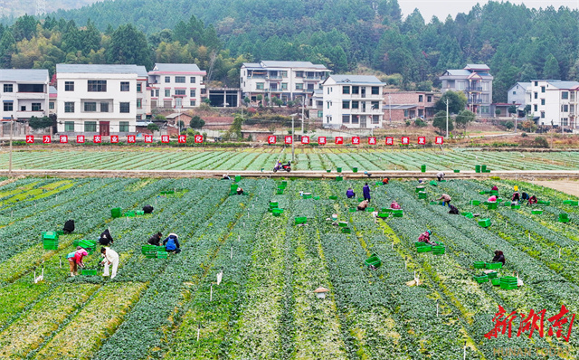 The photo, taken on December 3, shows villagers harvesting vegetables at Gangshang Village, Zhongshan Neighborhood, Xintian County. In recent years, the county has fully leveraged its selenium-rich soil resources, forged direct supply links with the Guangdong-Hong Kong-Macao Greater Bay Area for its vegetables, and adopted a "rice + vegetable" rotation mode to vigorously develop winter vegetable cultivation. This initiative ensures year-round farmland utilization, effectively boosting agricultural efficiency and increasing farmers' income. (Photo/Liu Guixiong)
