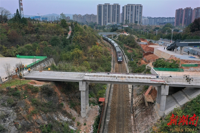 Recently, a pedestrian overpass crossing Hongxing North Road and the Jiaozuo-Liuzhou Railway, along with its supporting facilities, is in the final stage of construction. The overpass connects Longping Botanical Garden with Yingfeng Park in Huaihua City. Upon completion, the project will significantly shorten travel time between the two parks, making it more convenient for residents to enjoy leisure time. (Photo/Chai Junlin)
