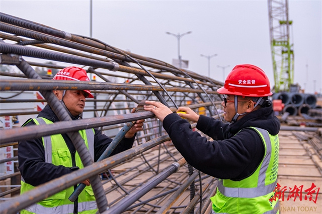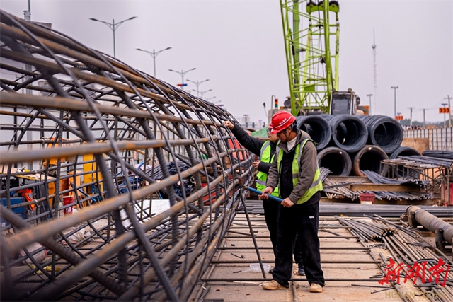 The photo, taken on December 4, shows construction workers undergoing final quality checks on components for the G354 Huangxing Avenue to Airport Central Axis Avenue Section (Xiangfu East Road Extension) Project. The entire project is constructed in accordance with Class I highway specifications, featuring a two-way six-lane main road with a designed speed of 80 km/h. Upon completion, the project will effectively optimize the regional trunk highway network, enhance the traffic capacity and service level of national highways, relieve the transit traffic pressure in Changsha's urban areas, and boost regional economic development. (Photo/Tong Zhenxi and Yu Miao, Hunan Daily)