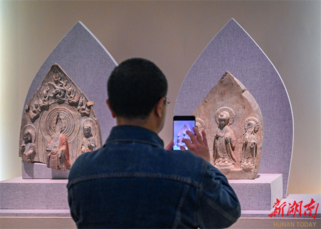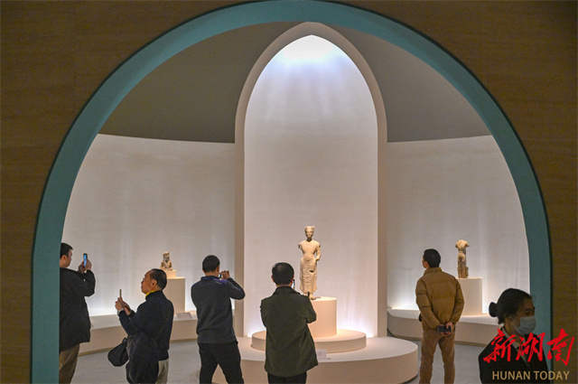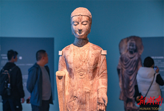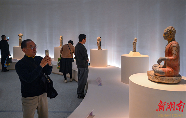 An art exhibition featuring Qingzhou-style Buddha statues kicked off at the Hunan Museum on November 21. The exhibition brings together 67 exquisite Buddha statues of the Northern Dynasties (386-581) from multiple cultural institutions, including the Qingzhou Museum, the Zhucheng Museum, and the Shandong Museum. With "Oriental Aesthetics" as its core theme, the exhibition systematically traces the artistic lineage of Qingzhou-style Buddha statues from an academic perspective. Through innovative exhibition design, digital displays, educational activities, and cultural and creative product development, it creates a comprehensive cultural experience that bridges the past and present while blending aesthetics and spirituality. It invites visitors to explore the aesthetic philosophy behind those eternal smiles. (Photo/Guo Liliang, Hunan Daily)