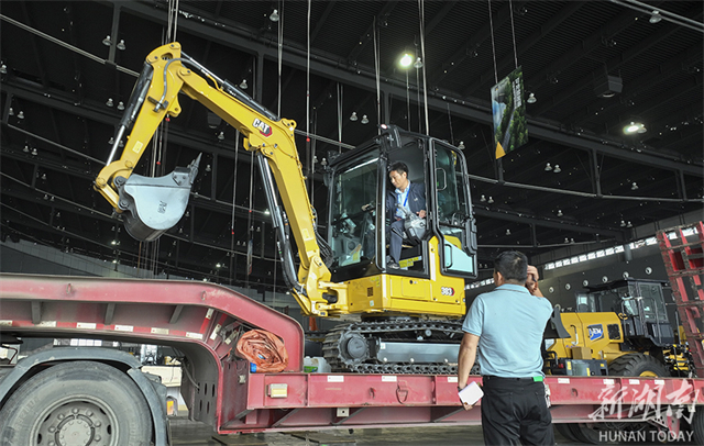 On May 7, 16 exhibits of Caterpillar, a global leader in construction machinery, entered the Changsha International Convention and Exhibition Center, ready to be presented at the upcoming exhibition. This is the third time that Caterpillar was invited to participate in the CICEE, which will kick off on May 12 this year. The Caterpillar's indoor and outdoor exhibition area exceeds 2,000 square meters. (Photo/Gu Pengbo and Xie Zhuofang, Hunan Daily)