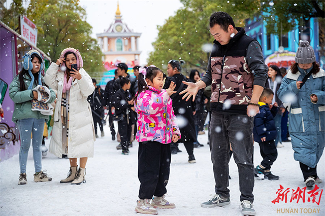 On December 20, tourists enjoyed a snow tour at Zhuzhou Fantawild Adventure. The New Year Ice and Snow Festival serial activities were launched at the Happy Tourism Zone of the park on the same day. The scenic spot has carefully designed all-weather artificial falling snow atmosphere, covering an area of 1,000 square meters. This creates an immersive experience for visitors, enabling them to indulge in the romantic ambience of winter. (Photo/Xu Xing, Hunan Daily)