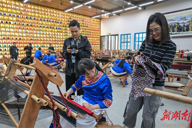 A group of Iranian and Vietnamese travelers visited a Tujia brocade base in Wulingyuan District, Zhangjaijie on April 26. Through observation and hands-on experience, they obtained an up-close understanding of Tujia brocade weaving techniques, a national intangible cultural heritage item in China. (Photo/Guo Liliang, Hunan Daily)
