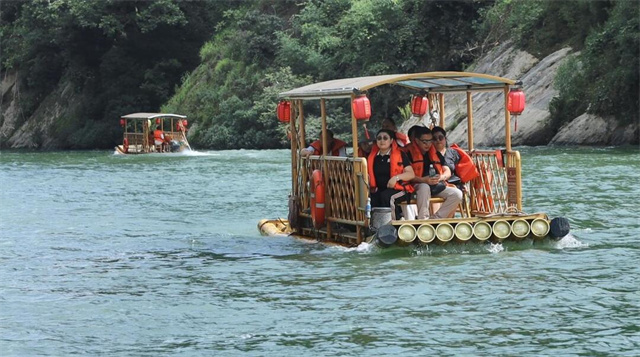 By the Fuyi River, the delegation experienced a bamboo rafting excursion. Gliding downstream on bamboo rafts, they witnessed crystal-clear waters mirroring the extraordinary peaks along both banks. With gentle breezes whispering through the air and birdsong echoing in serene mountains, this immersive journey allowed the foreign tourists to experience the unique charm of Langshan Mountain.
