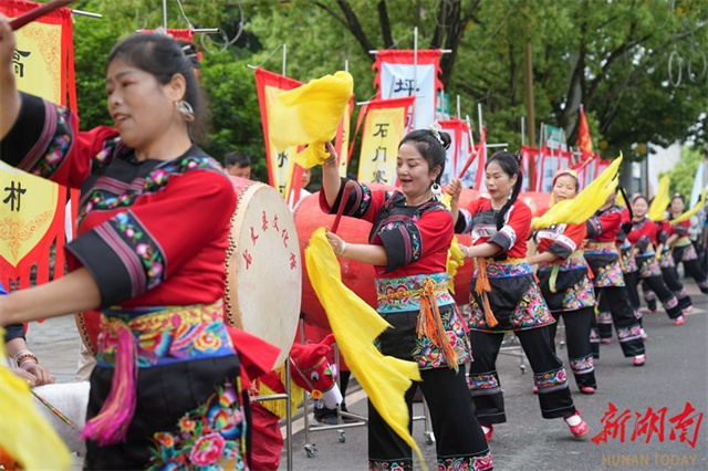 On April 20, the 2025 Tea Ancestor Festival and the Hunan (Guzhang) Tea Culture Tourism Festival opened at the Qifenghu Square in Guzhang County. Themed "Promoting Tea Ancestor Culture, Advancing Tea-Tourism Integration," the event fully showcased Guzhang's achievements in integrated development of the tea industry and tourism through industrial promotional activities, cultural performances, and a signing ceremony on business projects. The event injected new vitality into the high-quality development of Hunan's tea industry. The photo shows villagers staging a drum dance to welcome guests at the Qifenghu Square in Guzhang County. (Photo/Gu Pengbo and Liu Shiqi, Hunan Daily)