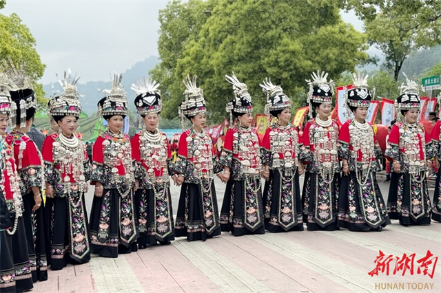 On April 20, the 2025 Tea Ancestor Festival and the Hunan (Guzhang) Tea Culture Tourism Festival opened at the Qifenghu Square in Guzhang County. Themed "Promoting Tea Ancestor Culture, Advancing Tea-Tourism Integration," the event fully showcased Guzhang's achievements in integrated development of the tea industry and tourism through industrial promotional activities, cultural performances, and a signing ceremony on business projects. The event injected new vitality into the high-quality development of Hunan's tea industry. The photo shows villagers in traditional costumes greeting guests at the Qifenghu Square in Guzhang County. (Photo/Gu Pengbo and Liu Shiqi, Hunan Daily)