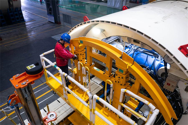 A worker debugs a tunnel boring machine at an industrial park in Changsha, central China's Hunan Province, Dec. 18, 2024. (Xinhua/Chen Sihan)