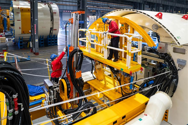Workers debug a tunnel boring machine at an industrial park in Changsha, central China's Hunan Province, Dec. 18, 2024. (Xinhua/Chen Sihan)