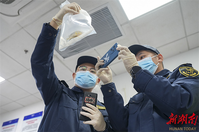 Over 800 ornamental fish from Africa were freighted by air from Addis Ababa, capital of Ethiopia, and arrived at Changsha Huanghua International Airport on March 16. After completing customs clearance procedures, the fish were transported to a designated quarantine site. They will undergo a 14-day quarantine peroid before being supplied to the markets. This marks the first import of African ornamental fish through a Hunan port. The photo shows an customs officer conducting document verification and quarantine inspections for these African fish at the international cargo station of Changsha Huanghua International Airport. (Photo/Gu Pengbo, Hunan Daily)