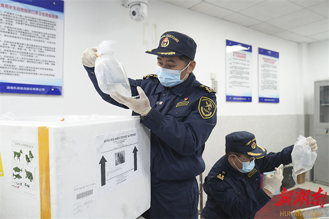 Over 800 ornamental fish from Africa were freighted by air from Addis Ababa, capital of Ethiopia, and arrived at Changsha Huanghua International Airport on March 16. After completing customs clearance procedures, the fish were transported to a designated quarantine site. They will undergo a 14-day quarantine peroid before being supplied to the markets. This marks the first import of African ornamental fish through a Hunan port. The photo shows customs officers conducting document verification and quarantine inspections for these African fish at the international cargo station of Changsha Huanghua International Airport. (Photo/Gu Pengbo, Hunan Daily)