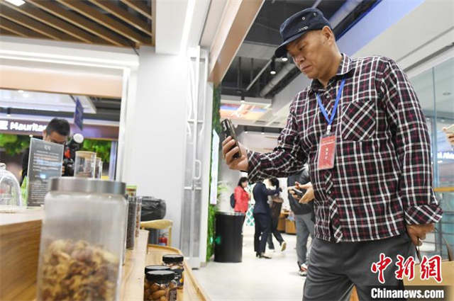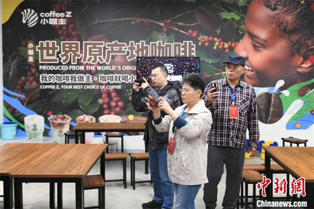 Some overseas Chinese media representatives take pictures at the African Coffee Experience Area. (Photo/Yang Huafeng, China News Service)