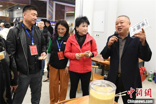 On October 29, media representatives from the 2024 Overseas Chinese Media Executives' Changsha Tour visited the Permanent Exhibition Hall of the China-Africa Economic and Trade Expo (CAETE), where they experienced the vibrant partnership between Changsha and Africa in economic and trade affairs. The photo shows the representatives learning about Attiéké, an African dish made from cassava. (Photo/Yang Huafeng, China News Service)