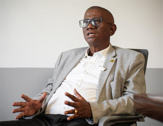 Michel Anondraka, director general of agriculture and livestock at Madagascar's Ministry of Agriculture and Livestock, speaks during an interview with Xinhua in Analamanga, Madagascar on March 27, 2025. (Xinhua/Li Yahui)