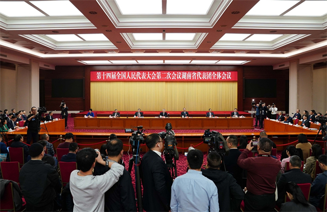 On March 7, the Hunan delegation at the 14th NPC second session held its fourth plenary meeting in Beijing, which was open to Chinese and foreign media. (Photo/Tang Jun and Liu Shangwen)