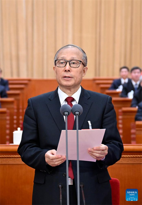 Zhang Jun, president of the Supreme People's Court (SPC), delivers a work report of the SPC at the second plenary meeting of the second session of the 14th National People's Congress (NPC) at the Great Hall of the People in Beijing, capital of China, March 8, 2024. (Xinhua/Liu Weibing)
