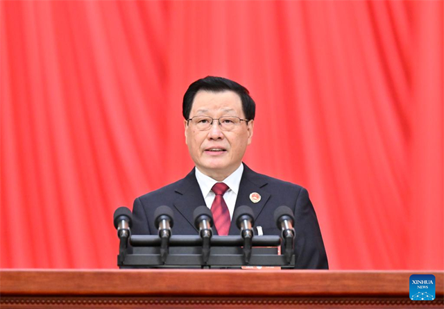 Zhao Leji, chairman of the National People's Congress (NPC) Standing Committee, delivers a work report of the NPC Standing Committee at the second plenary meeting of the second session of the 14th NPC at the Great Hall of the People in Beijing, capital of China, March 8, 2024. (Xinhua/Wang Ye)