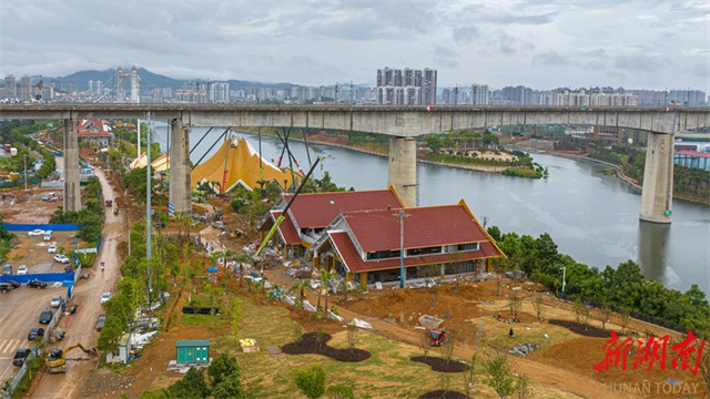 The photo, taken on July 22, shows a busy scene at the construction site of the ASEAN Complex Project in Hecheng District, Huaihua City. Currently, the main structures of the project's 11 venues and 25 individual buildings have been completed. As a key supporting project for the Fifth Hunan Tourism Development Conference, it is scheduled to be completed and put into use by the end of July. (Photo/Teng Zhenxi and Yang Jiajun)