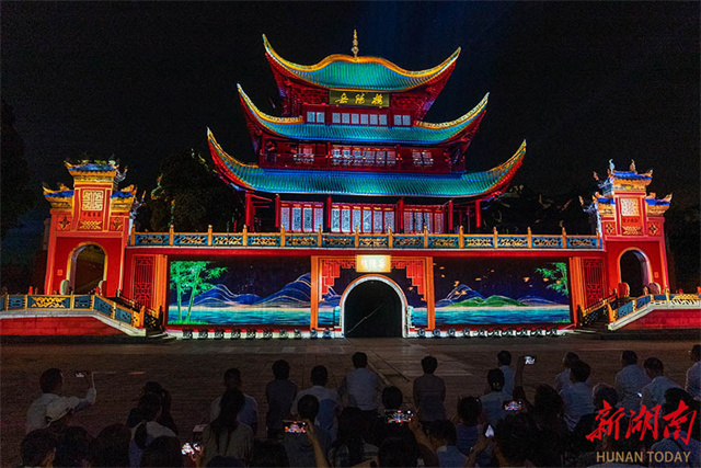 On the evening of May 25, guests and tourists watch an immersive drama titled "Ascending Yueyang Tower" at Yueyang Tower Scenic Area, Yueyang City.