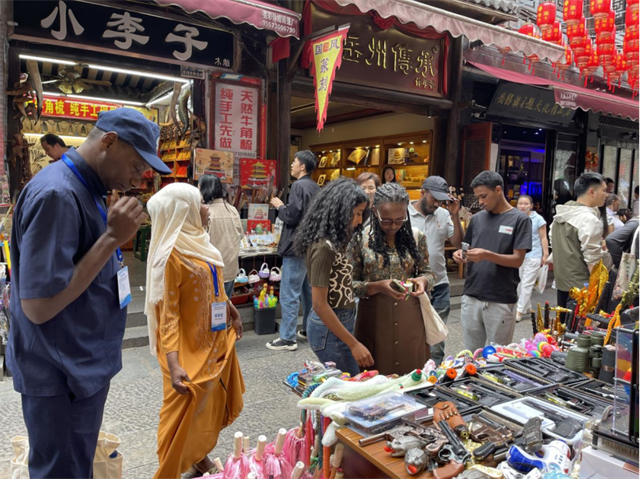 On Bianhe Street, the foreign guests were delighted by the dazzling array of distinctive souvenirs, like Hunan embroidery and cotton clothing. They eagerly selected some to take back to Africa.
