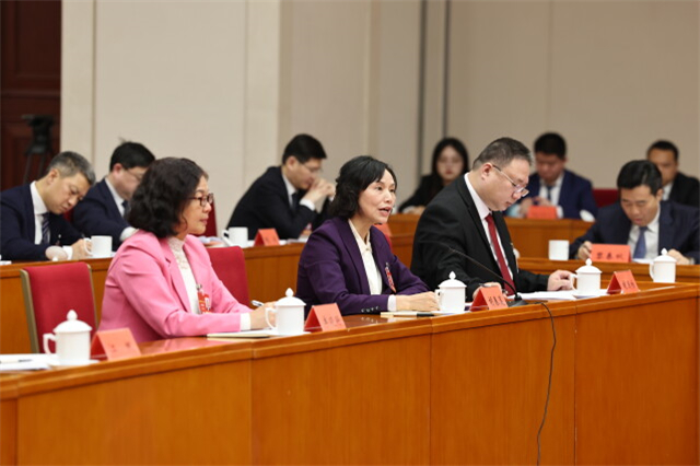On March 5, Huang Donghong (1st R), a Hunan-based member of the CPPCC National Committee, made a speech at a group discussion. (Photo/Gu Pengbo, Hunan Daily)