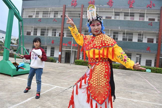 A cultural volunteer performs Peking opera for students at a primary school in Jiangyong County on October 30. The school launched a traditional opera themed event on that day, featuring various activities such as classic opera excerpts performances, opera facial makeup painting and instructions, and interactive sessions of opera postures. Through these activities, the students gained an up-close experience of the charm of this quintessential Chinese art. (Photo/Tian Rurui)