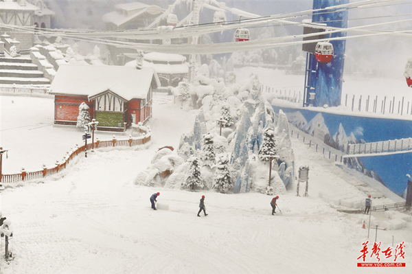 As the world's only theme park suspended in a 100-meter deep pit that features both snow and water activities, the Xiangjiang Joy Town Amusement Park is honored as “a miracle below the horizon”. It has two core amusement projects -- “Happy Snowfield” and "Happy Water Village”. The "Happy Snowfield" covers an area of 3,156 square meters, and is divided into snow-playing area and skiing area. Inside, there are two Alpine towns connected by snow cable cars and ropeways. It is an indoor snow and ice world with the most snow slides and the most diverse skiing experience in the country. The 80,000-sqm "Happy Water Village" is the “roof” of the amusement park. It is divided into three theme areas: family play area, wave pool, and screaming area (not open yet). It provides more than 20 water-playing facilities.