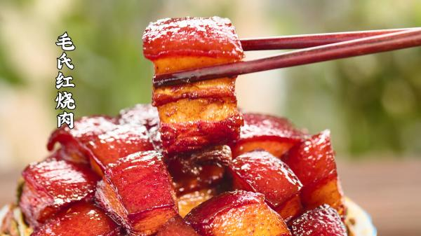 Mao's braised pork in brown sauce, a traditional delicacy in Hunan Province, is different from that in other places and listed in the ten classic Hunan dishes. It is made of pork belly stewed in tinted seasoning including sugar and cooking wine. The dish features a golden hue and a rich flavor.