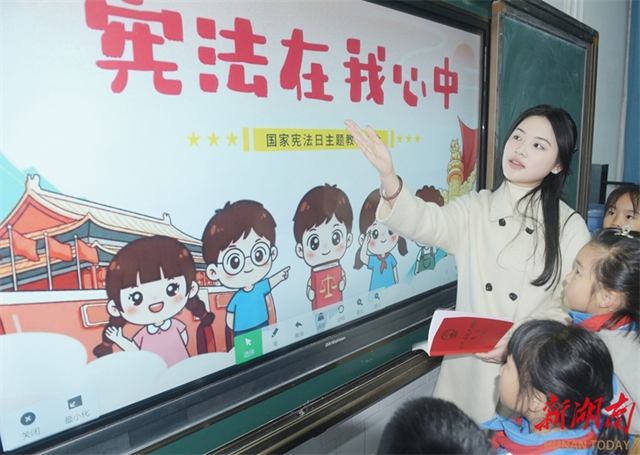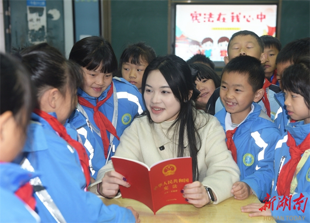 On December 3, a teacher imparts constitutional knowledge to students at Zhuquan Primary School in Jiahe County, ahead of the 12th National Constitution Day which falls on December 4. Various activities are being held across Hunan Province to promote public awareness of the Constitution. (Photo/Huang Chuntao)