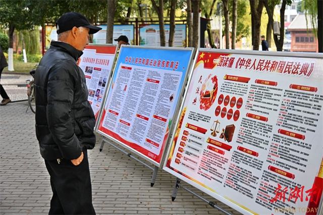 On December 3, a resident views display boards at Lanjiang Park in Lixian County, ahead of the 12th National Constitution Day which falls on December 4. Various activities are being held across Hunan Province to promote public awareness of the Constitution. (Photo/Bai Yipu and Tian Bingfang)