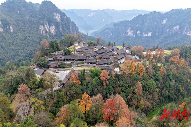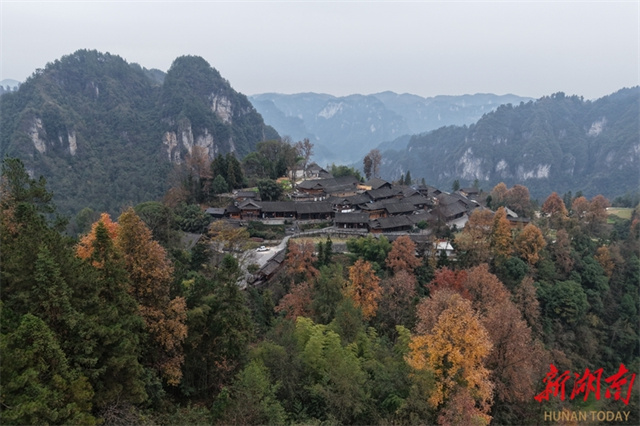 In early winter, Shibadong Village in Shuanglong Town, Huayuan County is cradled by mountains adorned with colorful foliage, resembling a natural oil painting and presenting breathtaking beauty. (Photo/Peng Biao)