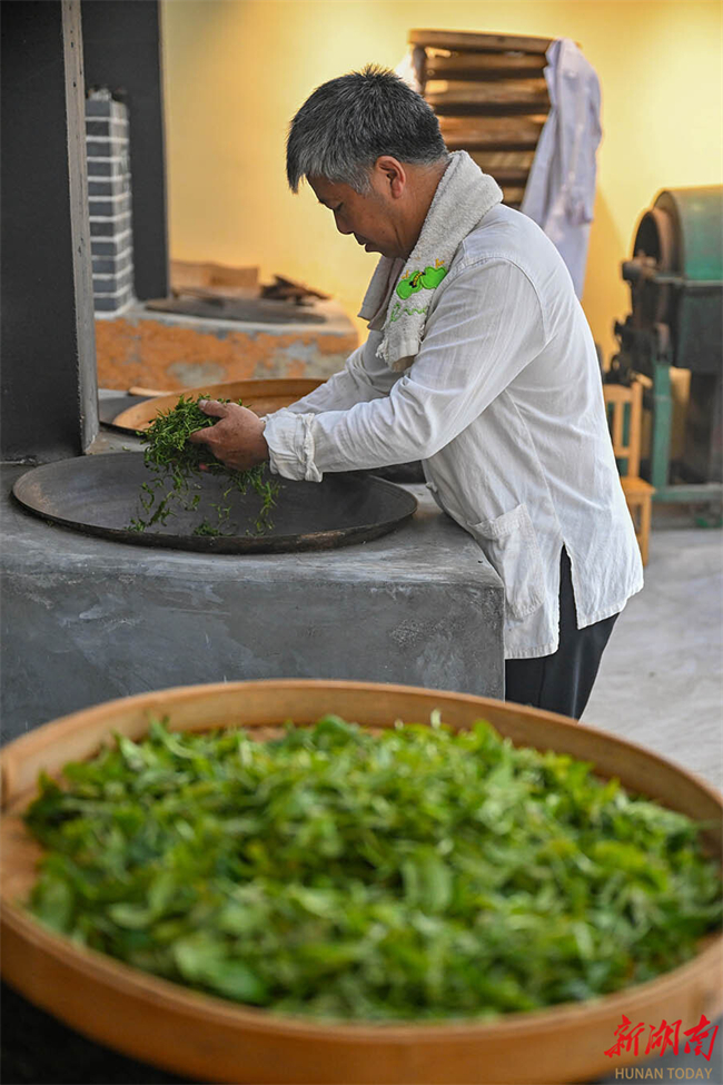 Driven by leading tea businesses and led by the representative inheritors of tea-making intangible cultural heritage, Guidong County has been continuously optimizing local tea-making techniques and improving tea quality in recent years. This has helped increase tea farmers' income. The photo, taken on June 17, shows Jiang Qiugui, a representative inheritor of Linglong tea making techniques, processing tea leaves by hand at Tongluo Village, Qingquan Town, Guidong County. (Photo/Guo Liliang, Hunan Daily)