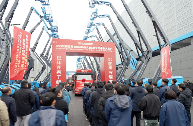 A ceremony celebrating Sinoboom AB46RJ batch delivery to the Middle East KA was held at the Sinoboom Changsha Plant on the morning of February 7, 2025. Dozens of over-ten-meter-long trucks loaded with Sinoboom articulating boom lifts departed from the plant, en route to customers in the Middle East. This marks a new record for a single export of articulating boom lifts in the industry.