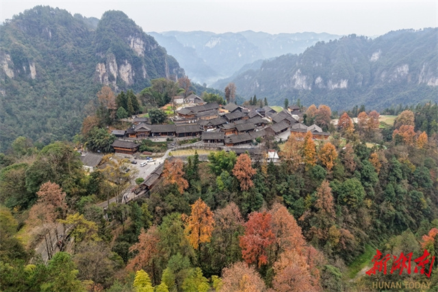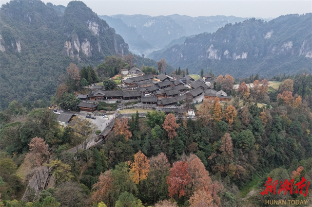 In early winter, Shibadong Village in Shuanglong Town, Huayuan County is cradled by mountains adorned with colorful foliage, resembling a natural oil painting and presenting breathtaking beauty. (Photo/Peng Biao)