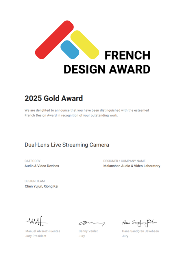 The Malanshan Audio & Video Laboratory announced on December 2 that its independently developed AI dual-lens live-streaming camera has won the highest honor at the 2025 French Design Award (FDA)--the Gold Award. This marks another international recognition for the camera, following its 2025 Muse Design Award Platinum Award.