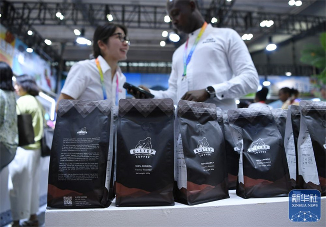 The photo, taken on June 12, shows coffee products from Rwanda displayed at the Changsha International Convention and Exhibition Center. (Photo/Jin Mamengni, Xinhua)