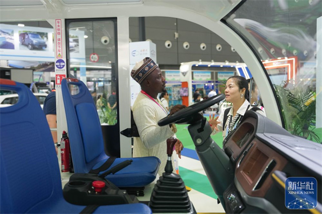 The photo, taken on June 12, shows an exhibitor (R) introducing a sightseeing vehicle to a visitor at the Changsha International Convention and Exhibition Center. (Photo/Xue Yuge, Xinhua)