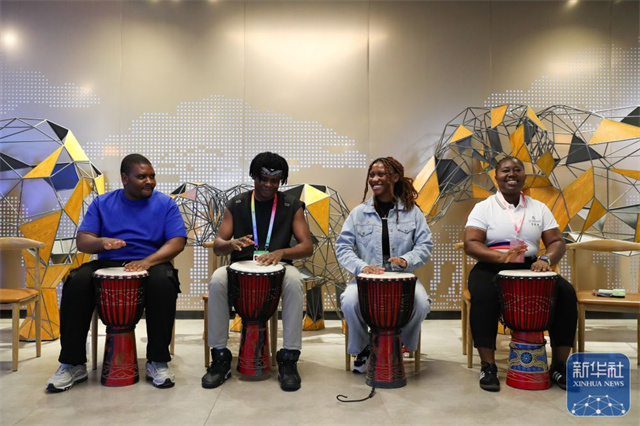 The photo, taken on June 12, shows African volunteers staging a hand drum performance for visitors at the Permanent Exhibition Hall of the China-Africa Economic and Trade Expo in Changsha. (Photo/Wang Jingqiang, Xinhua)
