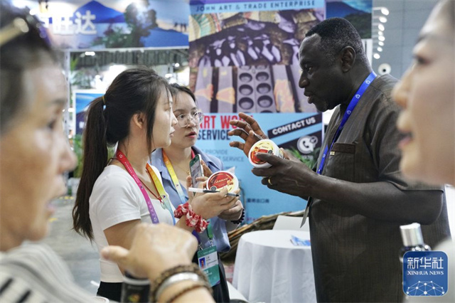 The photo, taken on June 12, shows an exhibitor introducing skincare products from Africa at the Changsha International Convention and Exhibition Center. (Photo/Liu Qiong, Xinhua)