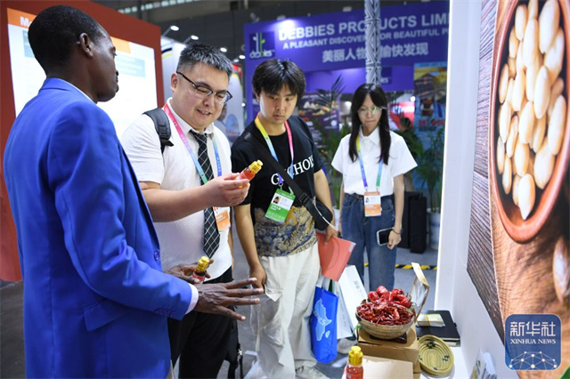 The photo, taken on June 12, shows an exhibitor introducing chili pepper products from Rwanda at the Changsha International Convention and Exhibition Center. (Photo/Jin Mamengni, Xinhua)