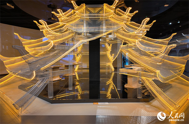 A wooden architecture of the Dong ethnic group on display supported by digital technology. (Photo/Huang Zhuo, People's Daily)