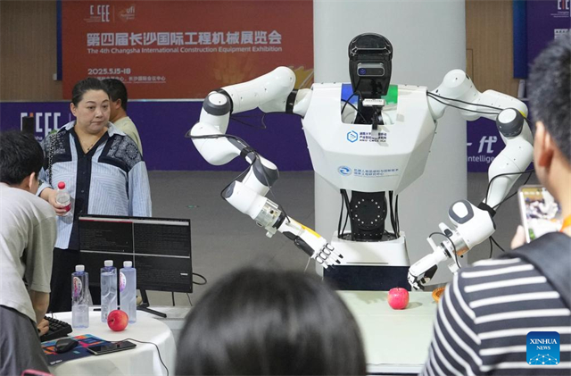 This photo taken on May 15, 2025 shows a scene during the 4th Changsha International Construction Equipment Exhibition in Changsha, central China's Hunan Province. The event is held here from May 15 to 18, featuring new-generation machinery equipment for construction, emergency service, mining, agriculture and transportation, with an exhibition area of 300,000 square meters. (Xinhua/Xue Yuge)