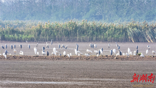 The photo shows a flock of migrant birds foraging and frolicking at the Baini Lake National Wetland Park in Yunxi District, Yueyang City. (Photo/Chen Shangbai)