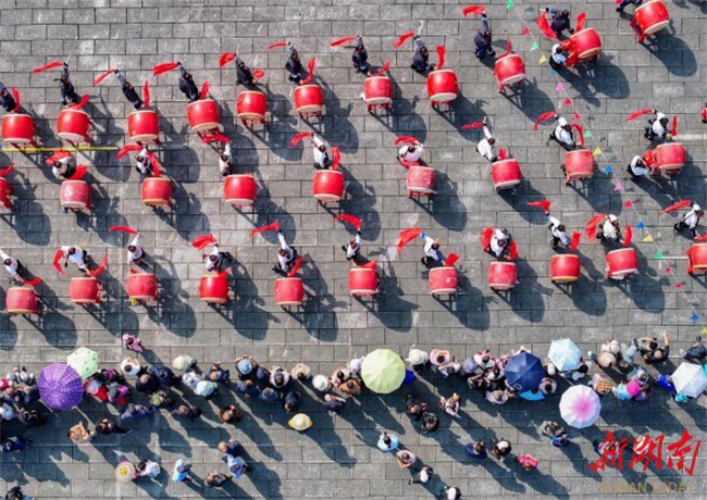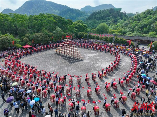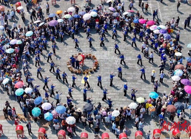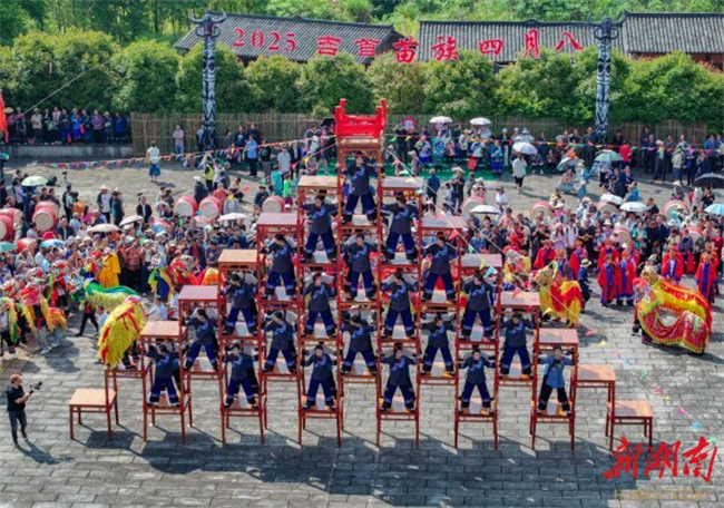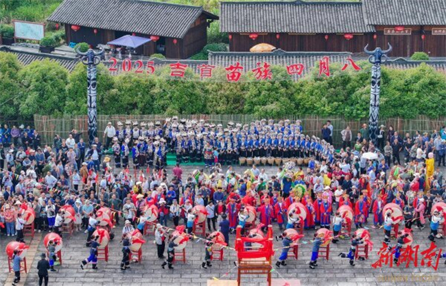 The Siyueba Festival is celebrated annually by the Miao people in Jishou City on the eighth day of the fourth Chinese lunar month. It fell on May 5 this year. Miao people from surrounding towns and villages donned traditional attire and participated in a series of folk custom activities, such as folk song gatherings, drum dance, a traditional Miao songs show, and lion dance performances. They celebrated the festival with numerous tourists, singing and dancing together, and immersing in traditional Miao ethnic customs and festive atmosphere. The Siyueba Festival of Miao ethnic minority has been inscribed in the third batch of China's national intangible cultural heritage programs. The photo shows performers staging a Miao drum dance performance at the Aizhai Wonder Scenic Area on that day. (Photo/Guo Liliang and Chen Sheng'ai, Hunan Daily)