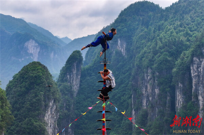 Miao performers stage a folk sports show at the Aizhai Wonder Scenic Area on May 5. (Photo/Guo Liliang and Chen Sheng'ai, Hunan Daily)