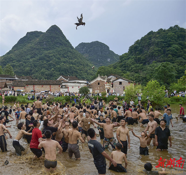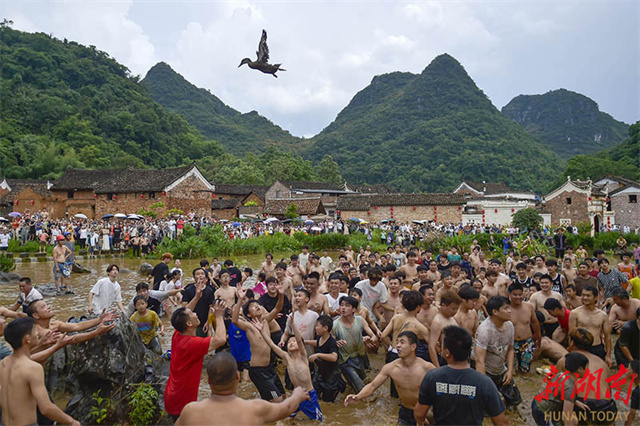 The photo, taken on June 8, shows people of the Yao ethnic group participating in a duck-catching event at Goulanyao Village, Lanxi Yao Township, Jiangyong County. In recent days, the Jiangyong County Authority has hosted a series of events for the Mud-washing Festival, attracting numerous tourists to celebrate the annual festival alongside the Yao people. As a traditional cultural festival of the Yao ethnic group, the Mud-washing Festival was included in the third batch of Hunan Provincial Intangible Cultural Heritage List in 2012. (Photo/Pan Baiwang)