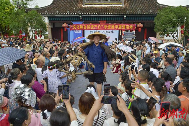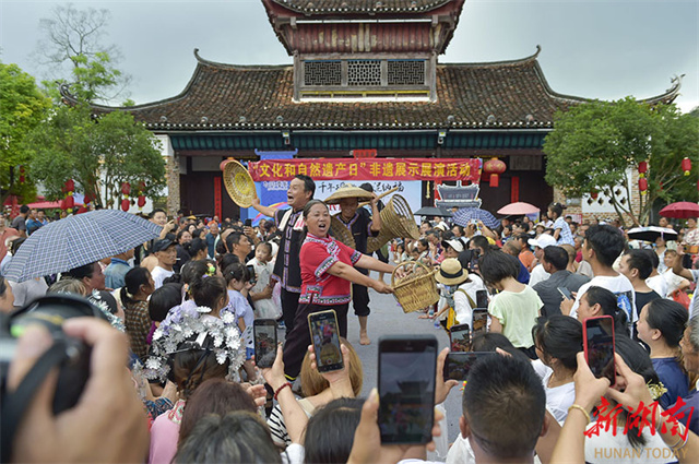 The photo, taken on June 8, shows people of the Yao ethnic group presenting farming culture-themed creations during a fashion show at Goulanyao Village, Lanxi Yao Township, Jiangyong County. In recent days, the Jiangyong County Authority has hosted a series of events for the Mud-washing Festival, attracting numerous tourists to celebrate the annual festival alongside the Yao people. As a traditional cultural festival of the Yao ethnic group, the Mud-washing Festival was included in the third batch of Hunan Provincial Intangible Cultural Heritage List in 2012. (Photo/Pan Baiwang)