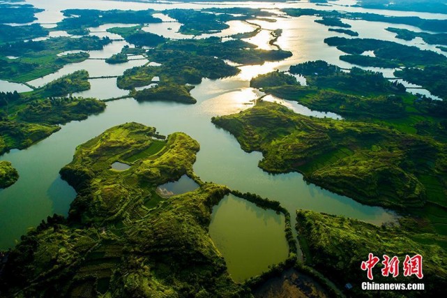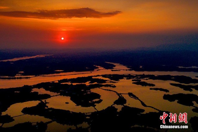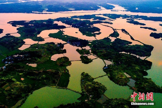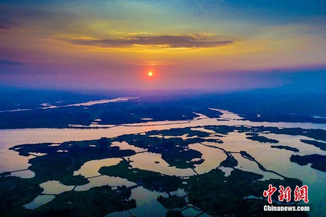 The photo hows the Chongling National Wetland Park in Guiyang County surrounded by waters and mountains looking gorgeous at sunset. The park, with a total area of 3,220 hectares, includes the Ouyanghai Reservoir, part of the Chongling River, and some surrounding mountainous areas. It forms a narrow corridor with 29.3 km long from north to south and 14.6 km wide from east to west. There are five functional areas within the park; namely, the wetland conservation area, restoration and reconstruction area; educational demonstration area; rationally used area; and, management service area. (Photo/Ouyang Changhai)