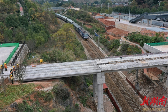 Recently, a pedestrian overpass crossing Hongxing North Road and the Jiaozuo-Liuzhou Railway, along with its supporting facilities, is in the final stage of construction. The overpass connects Longping Botanical Garden with Yingfeng Park in Huaihua City. Upon completion, the project will significantly shorten travel time between the two parks, making it more convenient for residents to enjoy leisure time. (Photo/Chai Junlin)